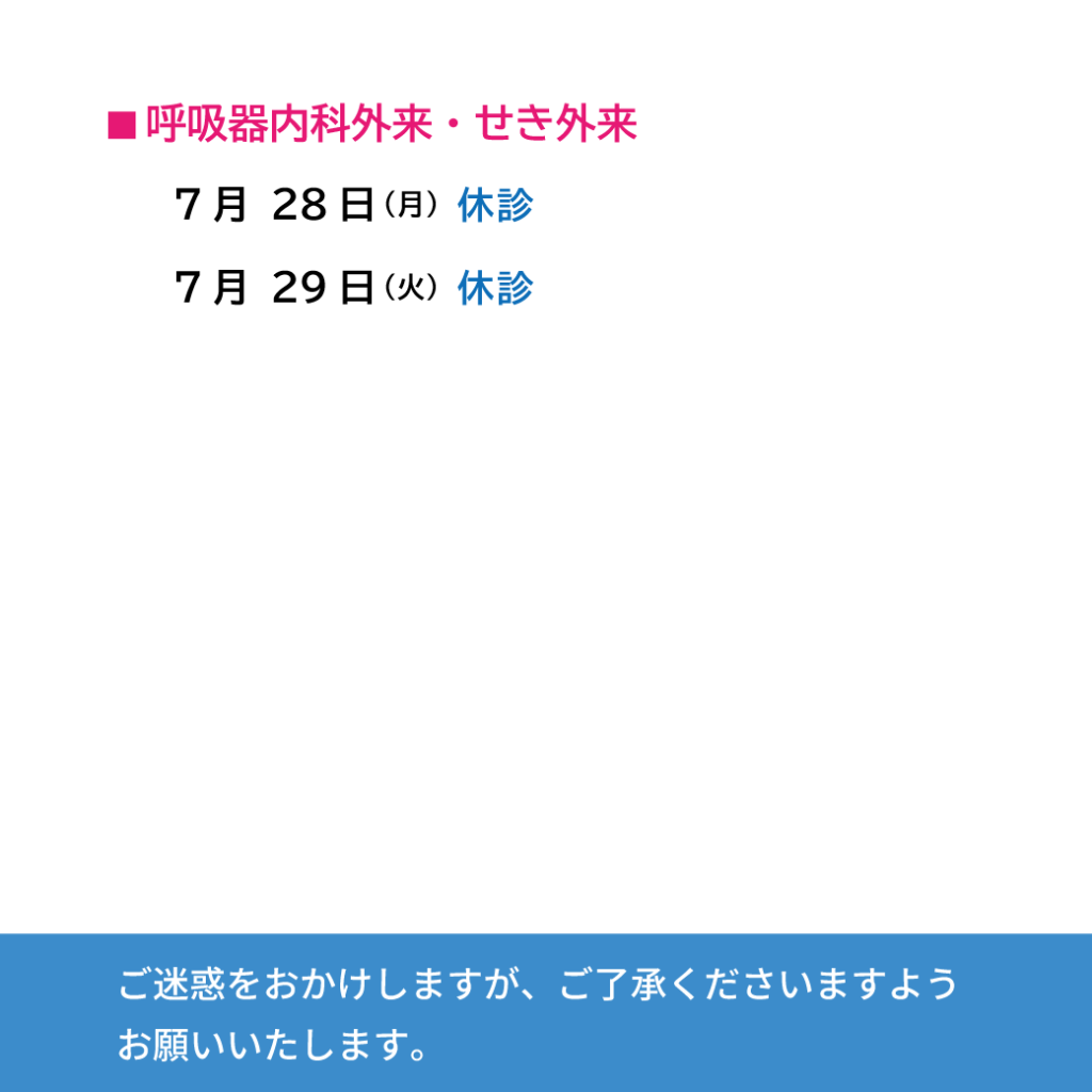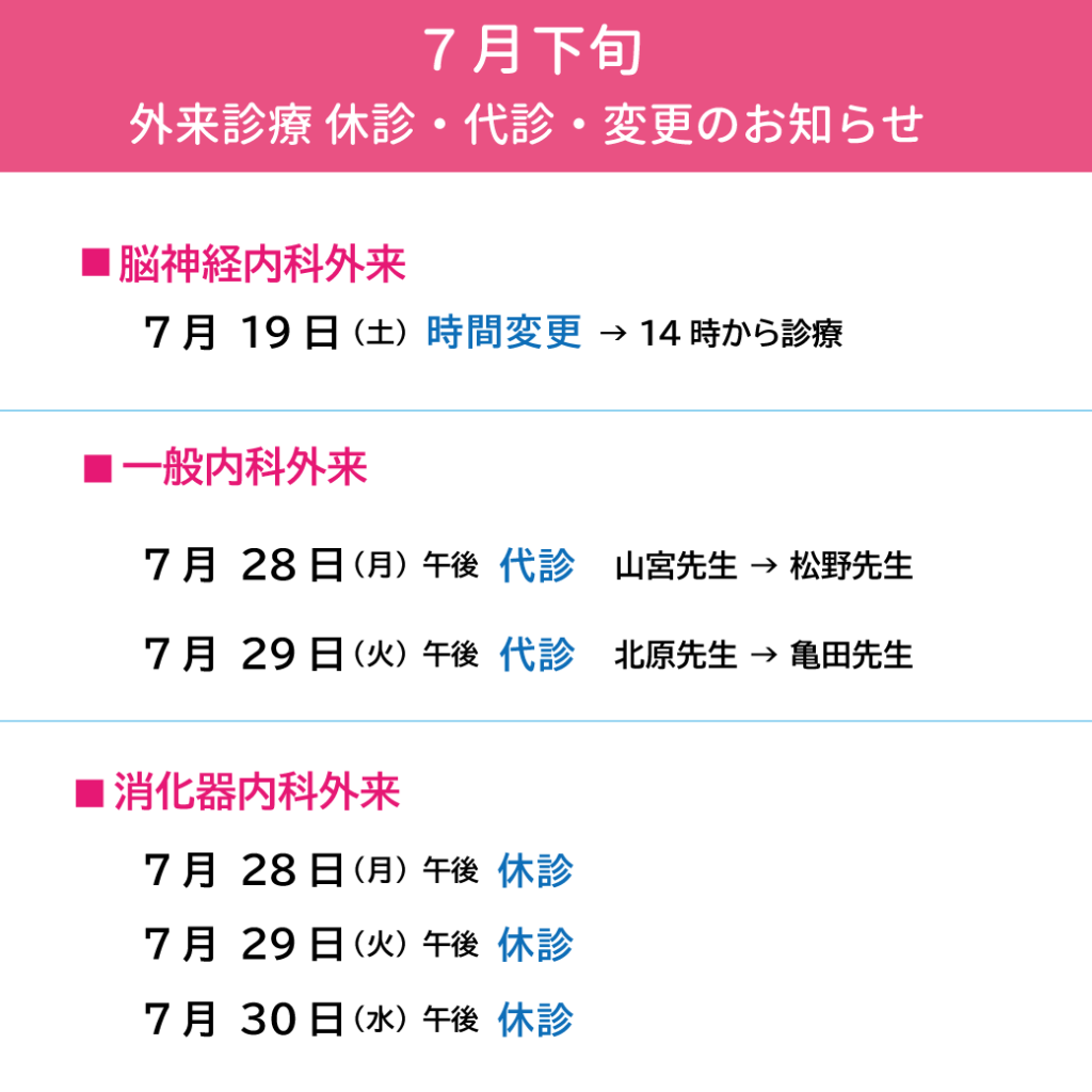 【小松ソフィア病院】2025年7月下旬 外来診療 休診・代診・変更のお知らせ