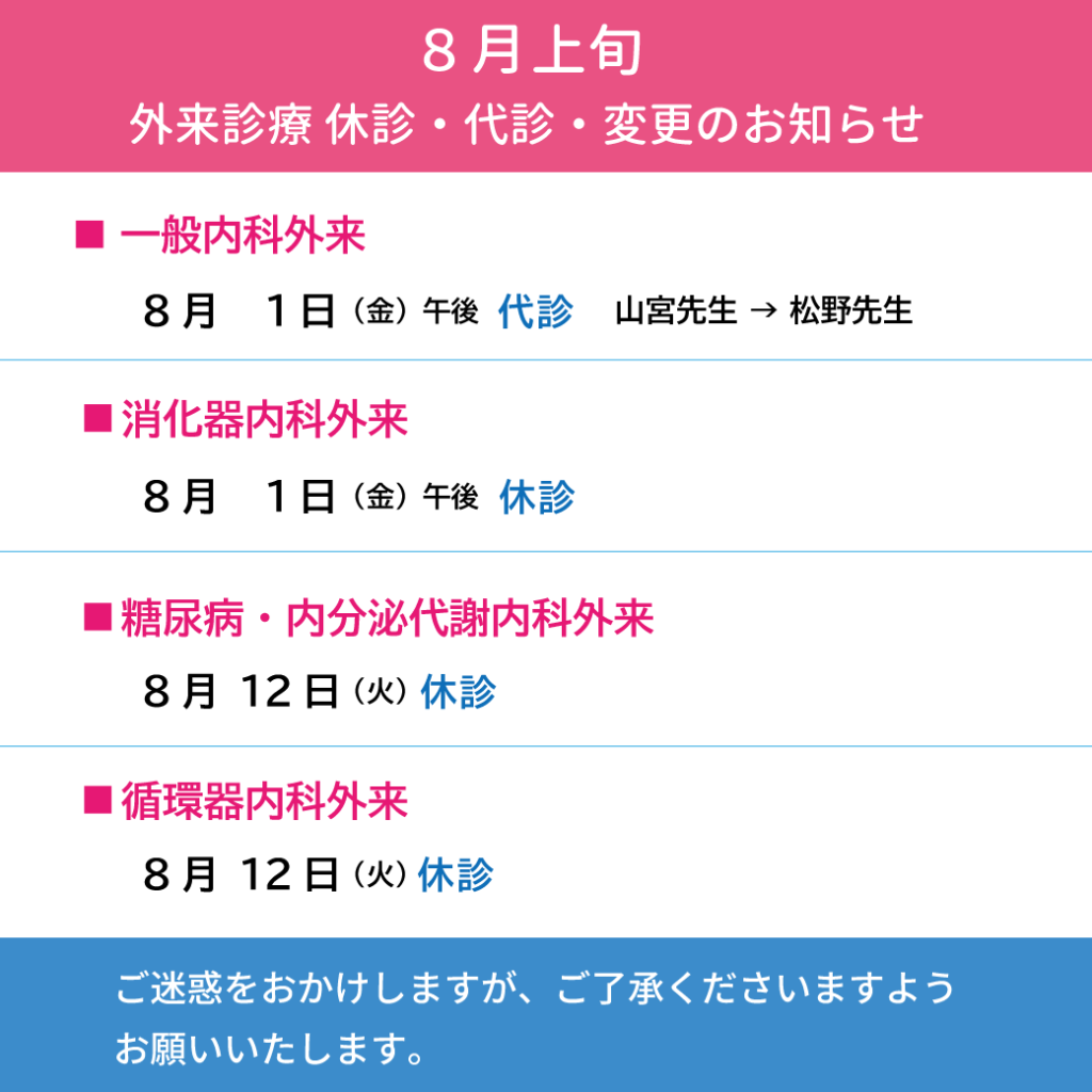 【小松ソフィア病院】2025年8月上旬 外来診療 休診・代診・変更のお知らせ