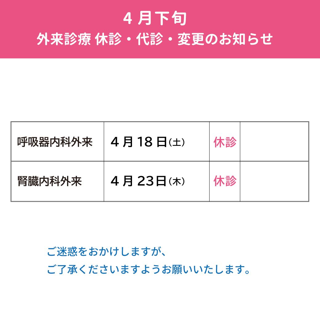 【小松ソフィア病院】2026年4月下旬 外来診療 休診・代診・変更のお知らせ