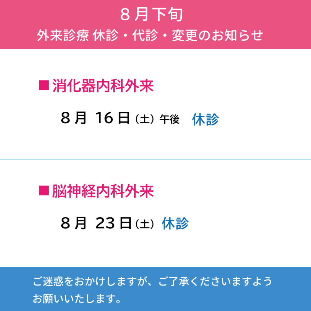 【小松ソフィア病院】2025年8月下旬 外来診療 休診・代診・変更のお知らせ