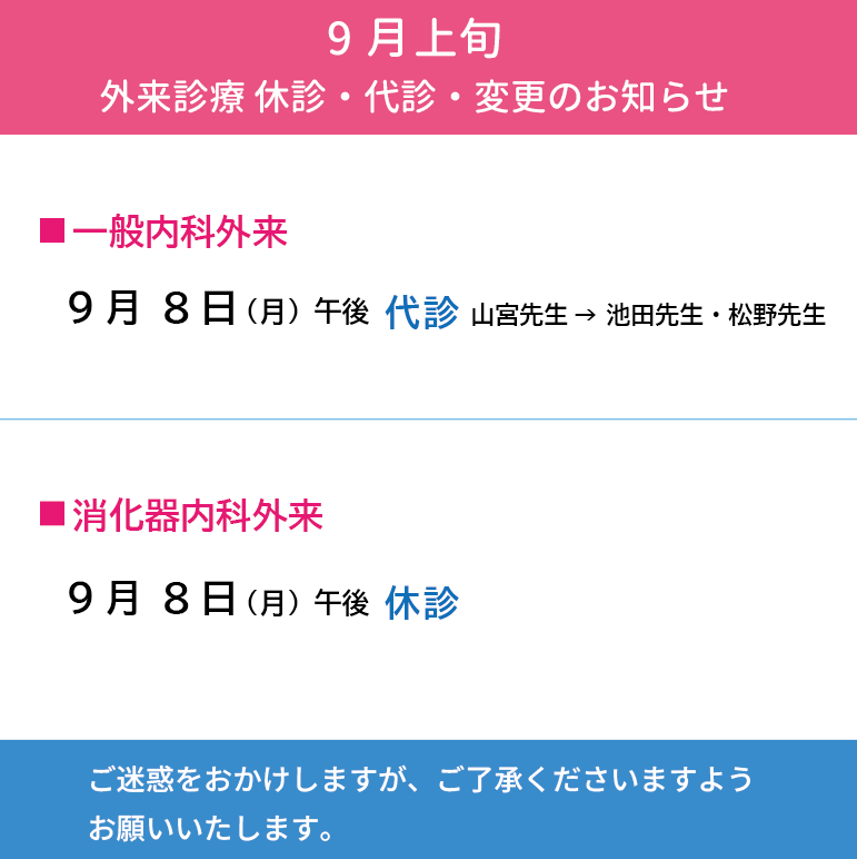 【小松ソフィア病院】2025年9月上旬 外来診療 休診・代診・変更のお知らせ