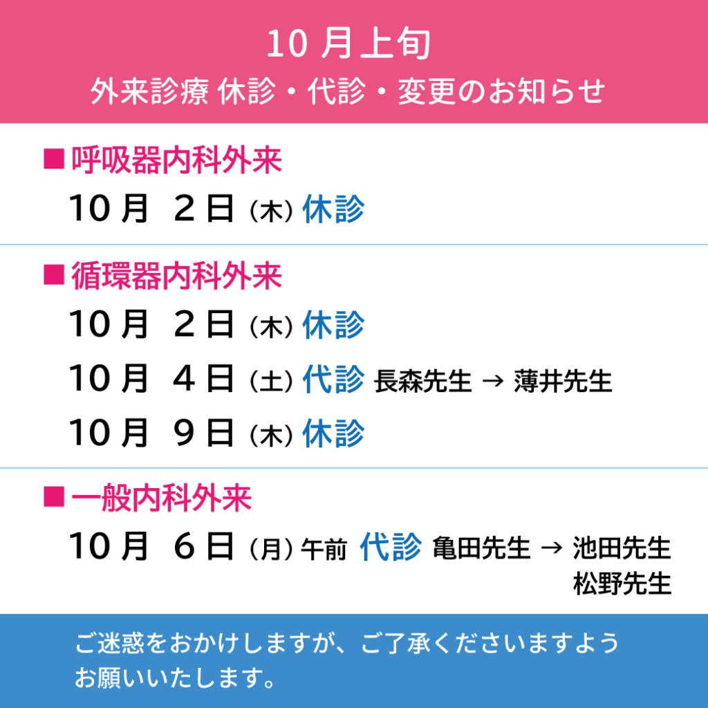【小松ソフィア病院】2025年10月上旬 外来診療 休診・代診・変更のお知らせ